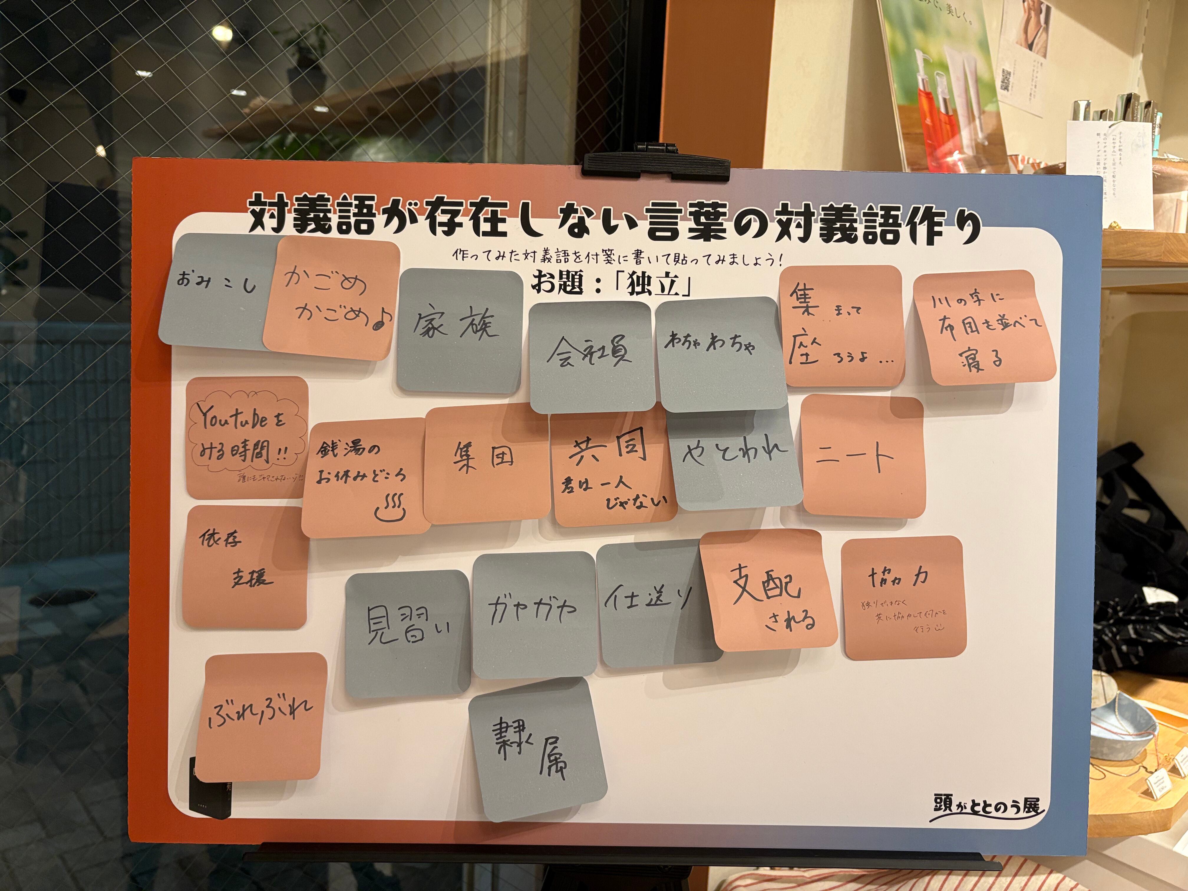 「独立」をお題とし、広辞苑上の意味を踏まえて思い思いの対義語を書いてみる→付箋に貼っていく